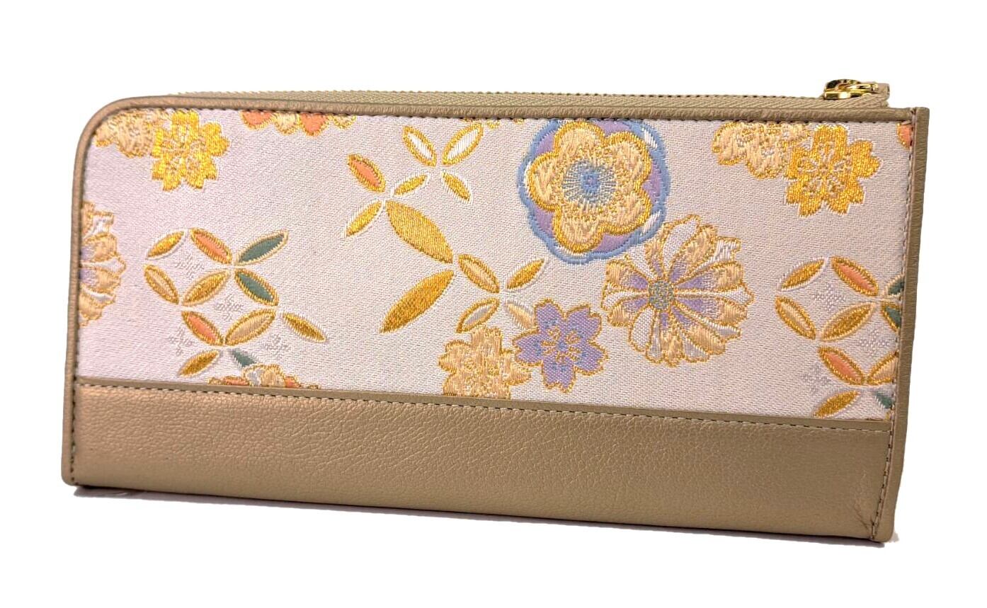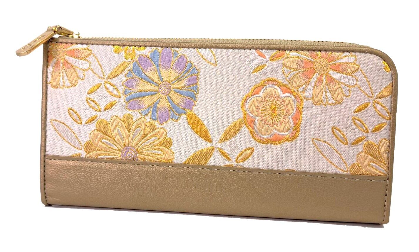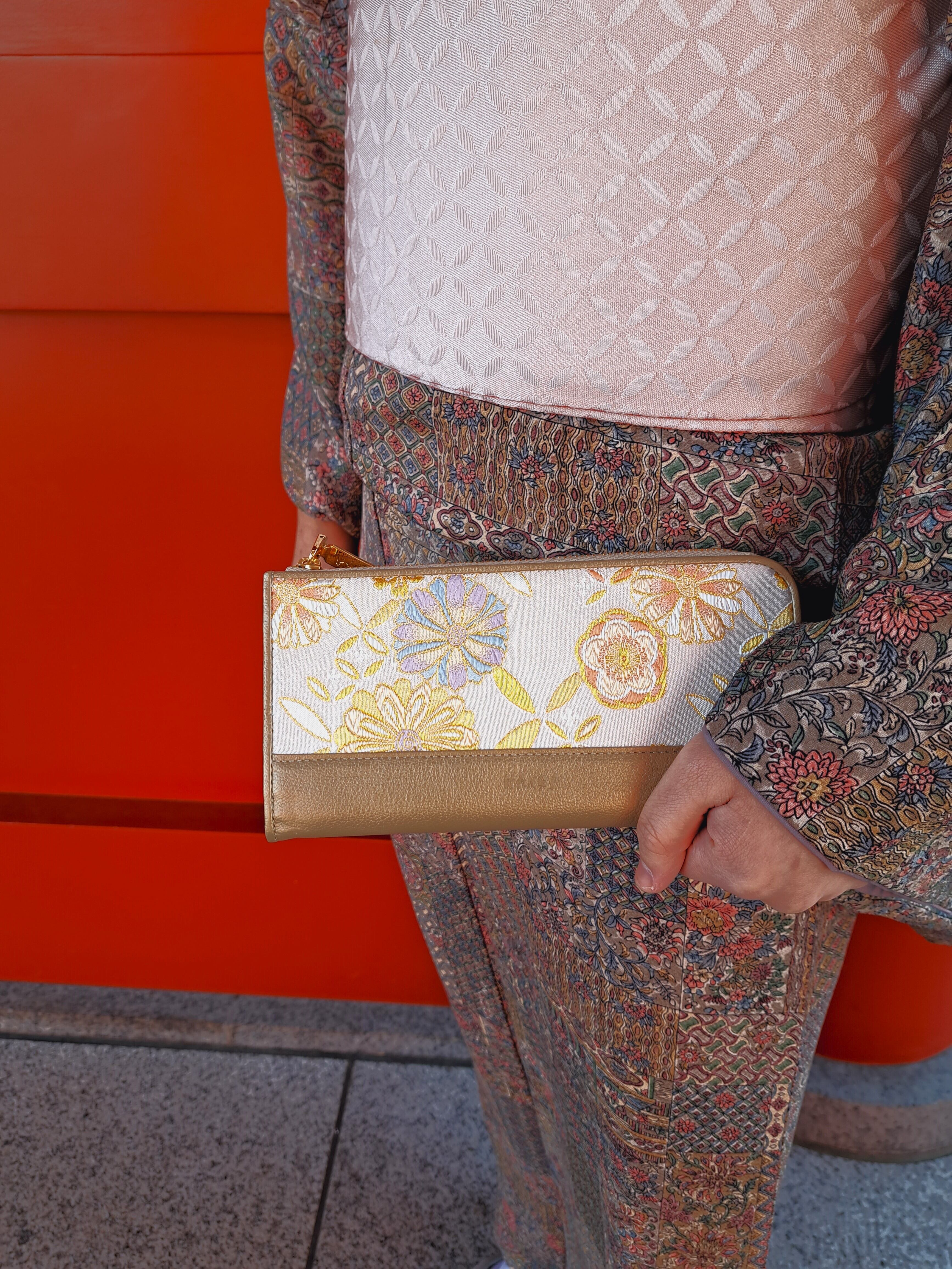 強い印象を与える金襴の柄とのバランスを整え、高級感を与え、和装だけでなく洋装でも使えるお財布に昇華しました。