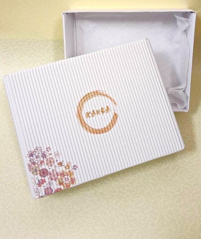 扇子を思わせる蛇腹加工を施したマットな和風な紙材を使ったブランドロゴ入りのオリジナルのボックスに入れてお届けします。