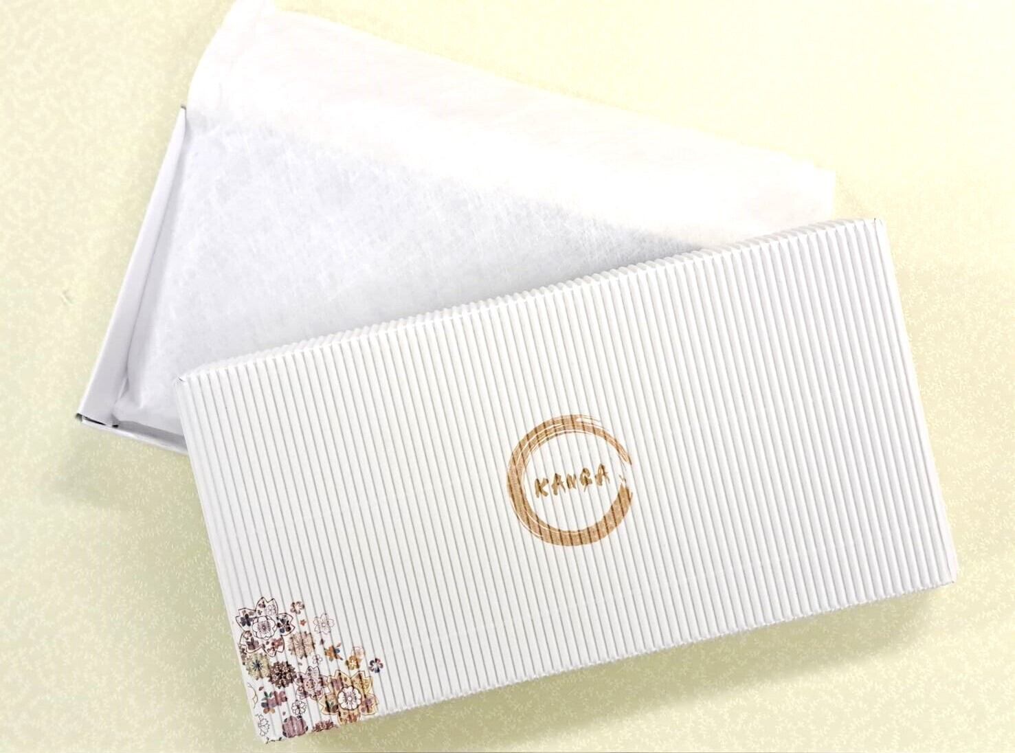 扇子を思わせる蛇腹加工を施したマットな和風な紙材を使ったブランドロゴ入りのオリジナルのボックスに入れてお届けします。